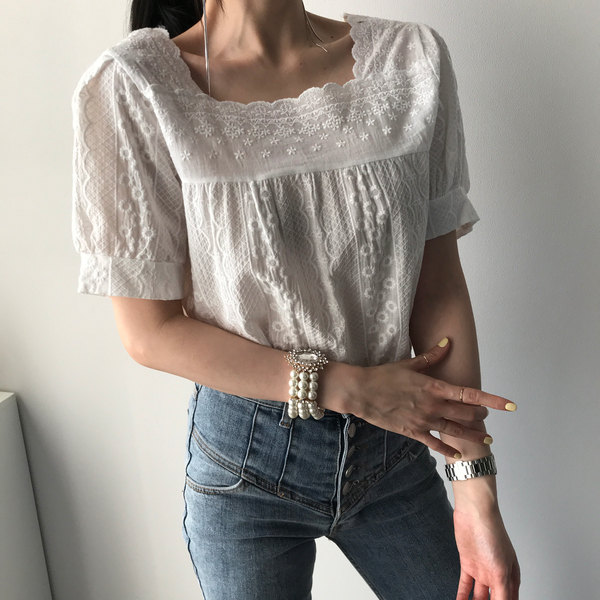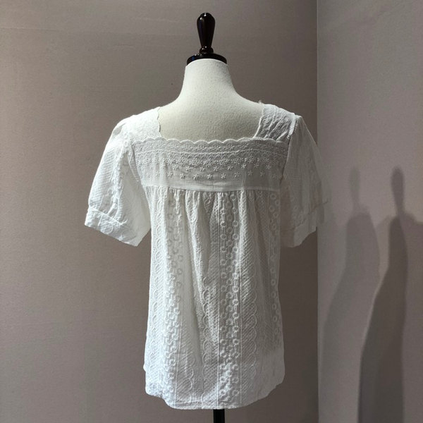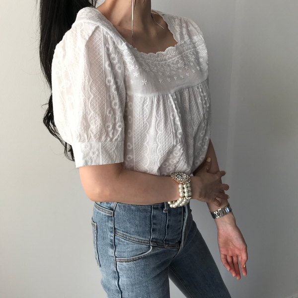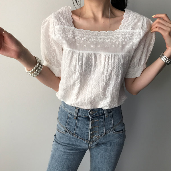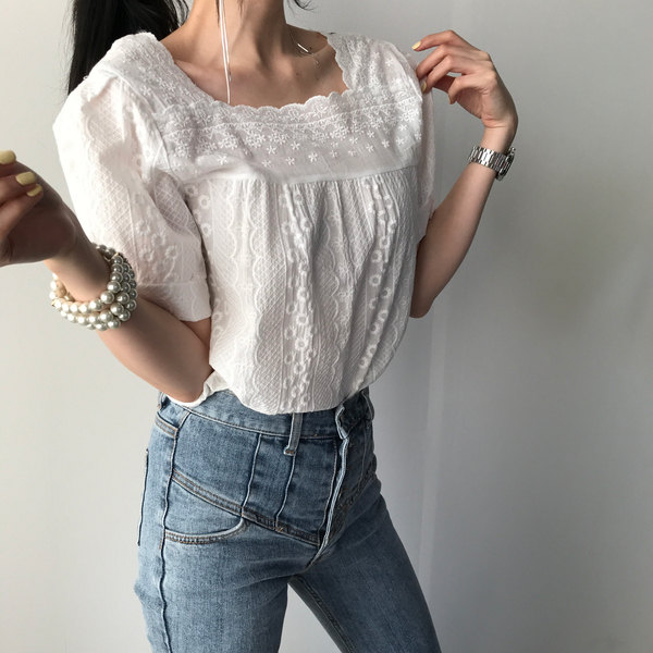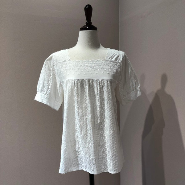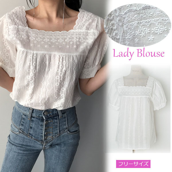 即納 送料無料 ブラウス レース トップス シャツ 半袖 レディース チュールレース パフスリーブ ボートネック おしゃれ きれいめ オフィス 春夏 大人