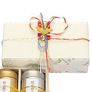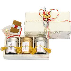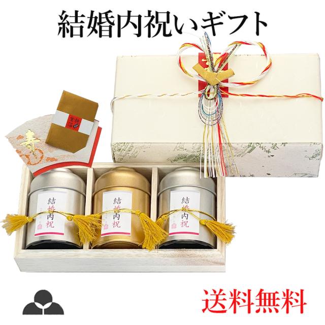 結婚内祝専用の缶を3本、木箱に入ります。お茶に入れる金箔と、水引、寿の短冊が付きます。