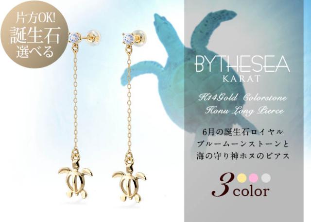 ハワイアンジュエリー ピアス 6月の誕生石 ロイヤルブルームーンストーン 幸せ運ぶホヌ チェーン 揺れる カラーストーン 片耳(1個)購入可 K14イエロー ピンク ホワイト 選べる シリコンキャッチ BY THE SEA バイザシー プレゼント ホワイトデー 【品番:GE502-6】