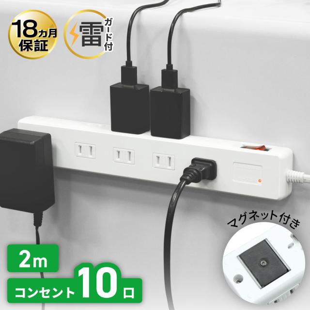 【送料無料】STYLED マグネット付電源タップ コンセント×10口 電源コード2m 18ヵ月保証 雷ガード ほこり防止シャッター ブレーカー 一括集中スイッチ マグネット OAタップ 延長コード ホワイト STP10W-2
