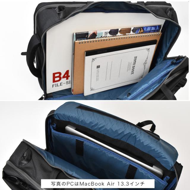 B4サイズまで収納可能で、メインルームが2箇所に分かれている2気室デザインのため、一方に書類や小物、もう一方にPCを収納するなど、用途に応じて使い分けることができます。