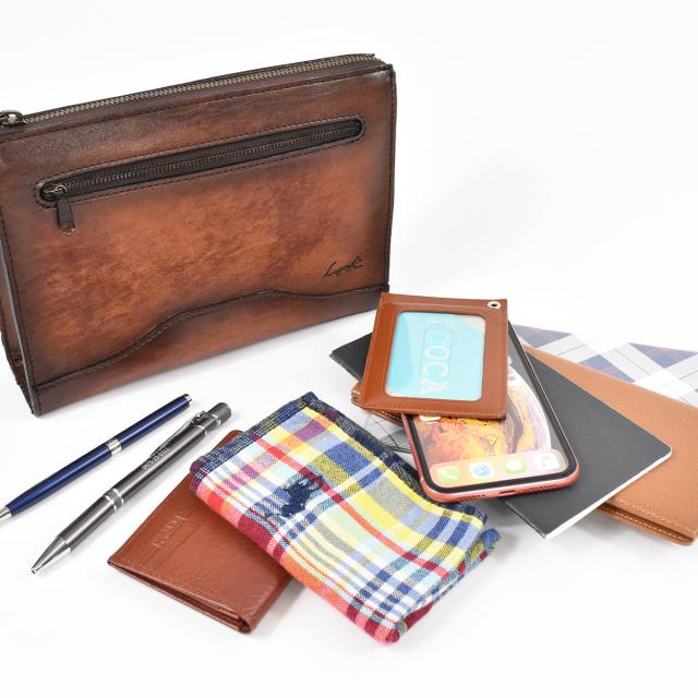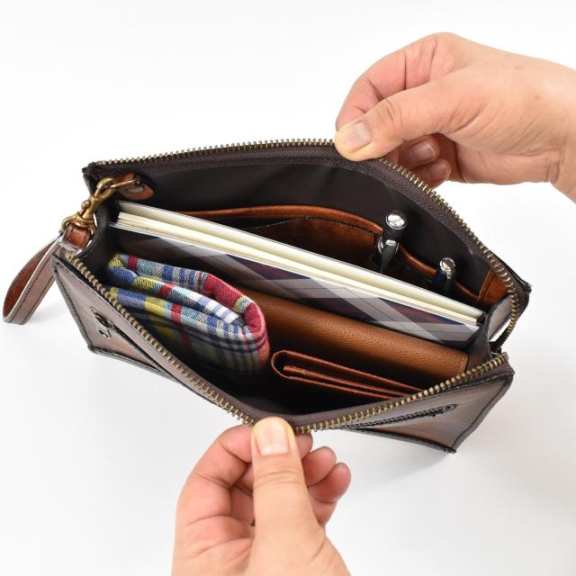 小さめのモデルながら必要な小物をしっかり収納。長財布(横幅約19cm)がぴったり入るサイズで、スマホ、手帳、筆記用具、パスケースなどを収納できます。