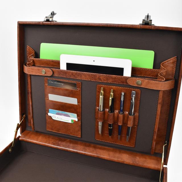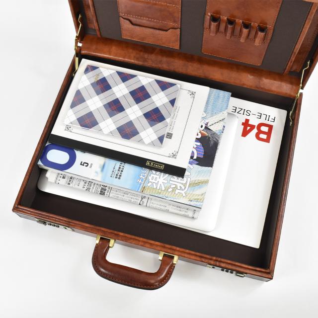 B4サイズまで収納可能な大容量アタッシュケース。書類・手帳・小物類など、ビジネスシーンに必要なアイテムをしっかり収納できます。