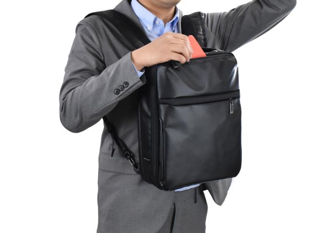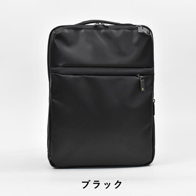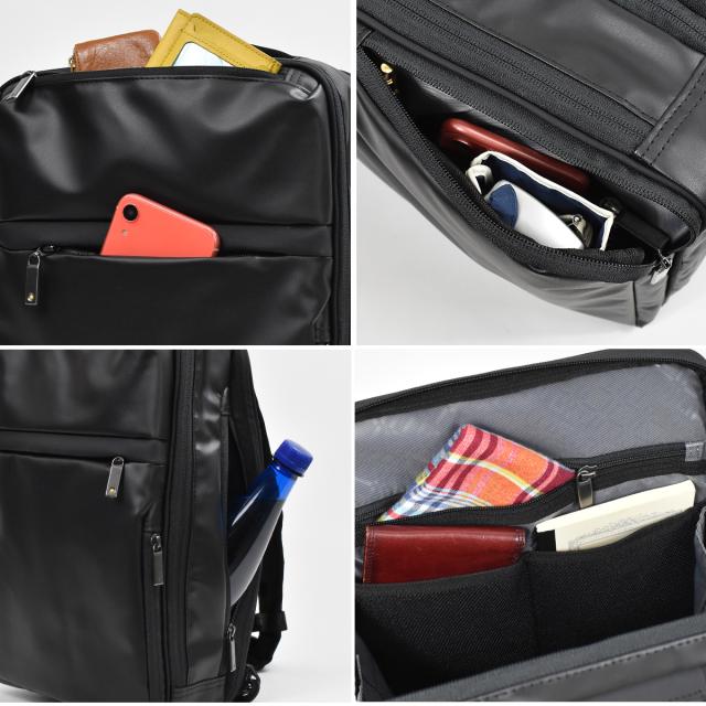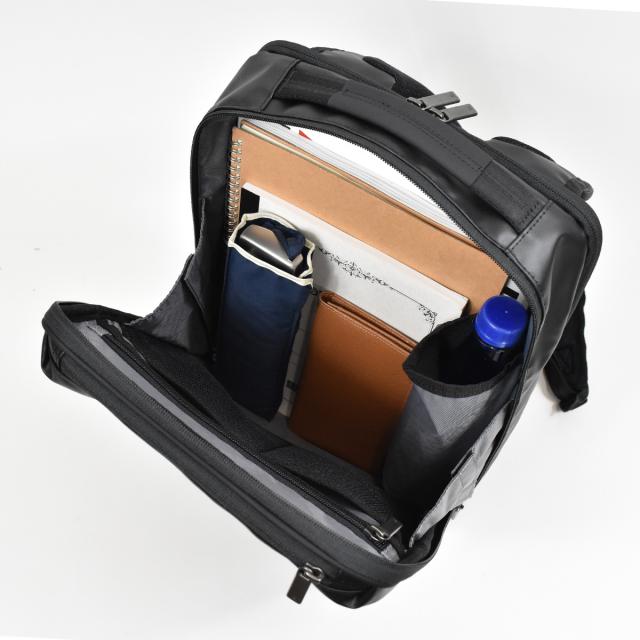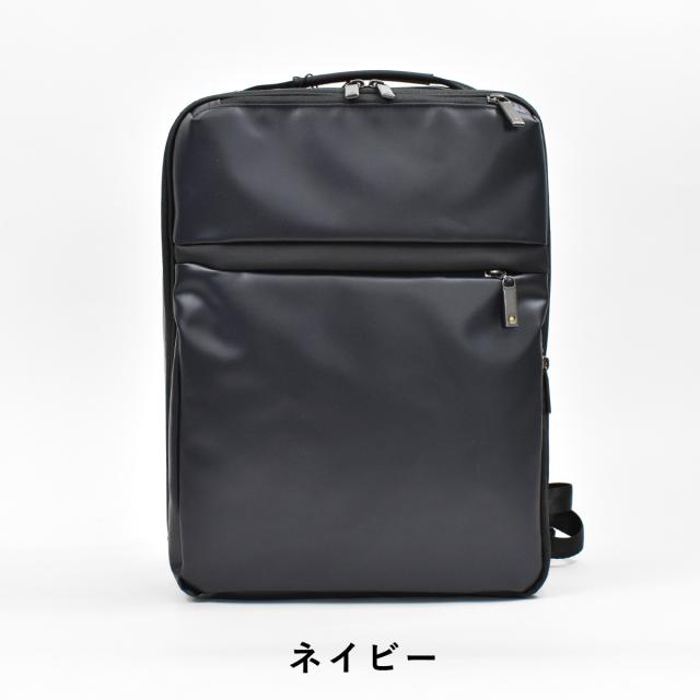 スリムなボディに収納力を凝縮したビジネスリュック。耐水性に優れたウォーターレジストタイプです。体の前に回した時も物の出し入れが容易で通勤ラッシュの混雑時などでも快適に過ごせます。