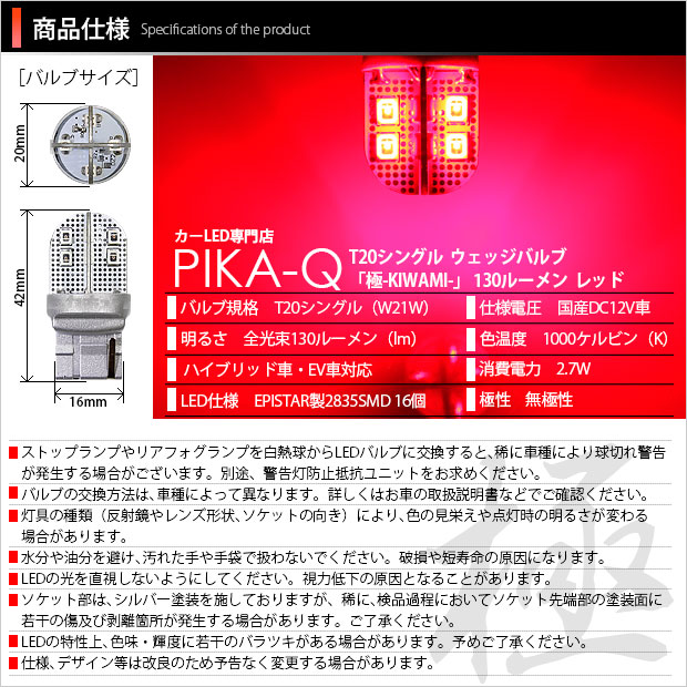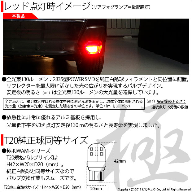 | ピカキュウ,LED専門店,LEDバルブ,国産DC12V車,ハイブリッド車対応LEDバルブ,T20シングル,W21W,リアフォグランプ,後部霧灯,レッド,全光束130lm,極,KIWAMI,きわみ,SUBARU,スバル,XV,GT7,GT3,GTE |