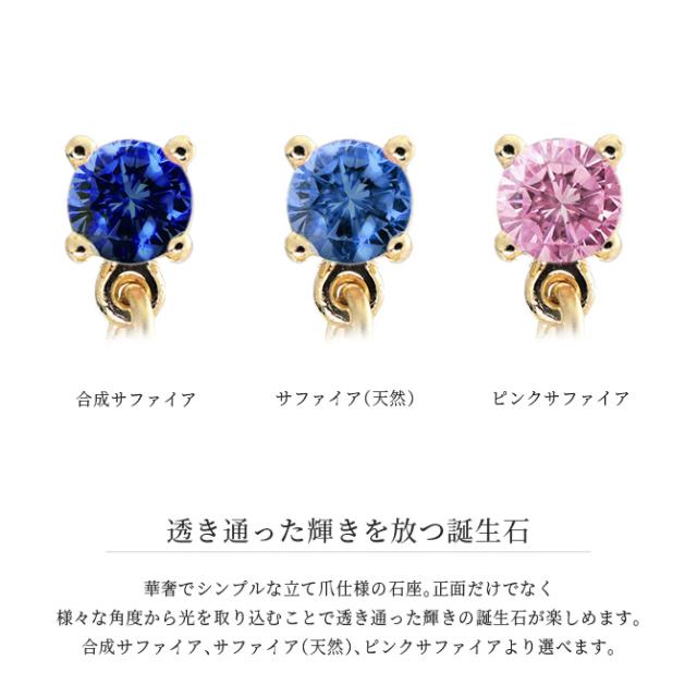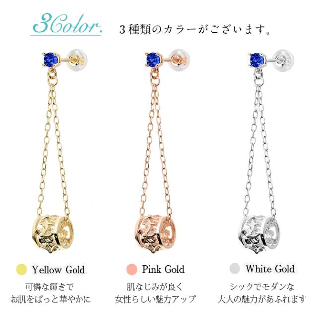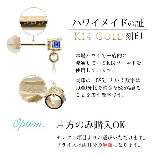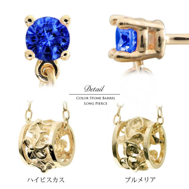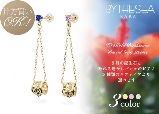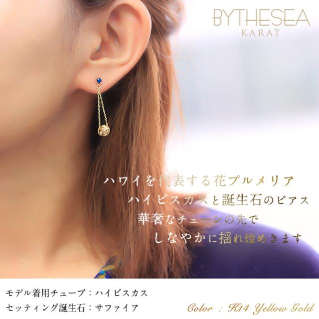 ハワイアンジュエリー ピアス 9月の誕生石 サファイア 透かしバレル チェーン カラーストーン プルメリア ハイビスカス 揺れる 片耳(1個)購入可 K14イエロー ピンク ホワイト 選べる BY THE SEA バイザシー プレゼント 母の日 【品番:GE302-9】