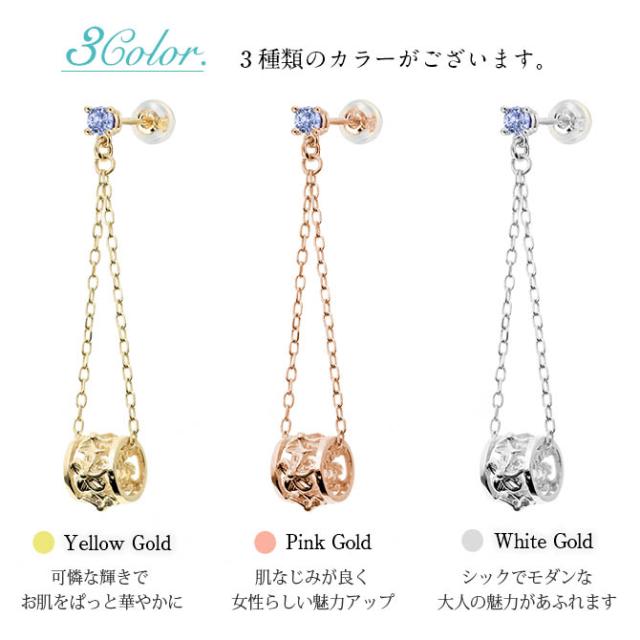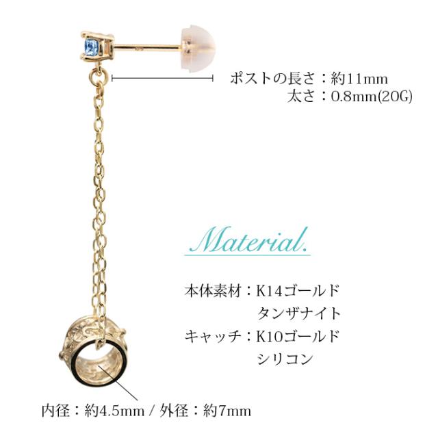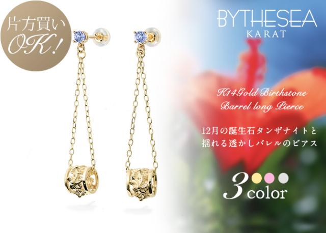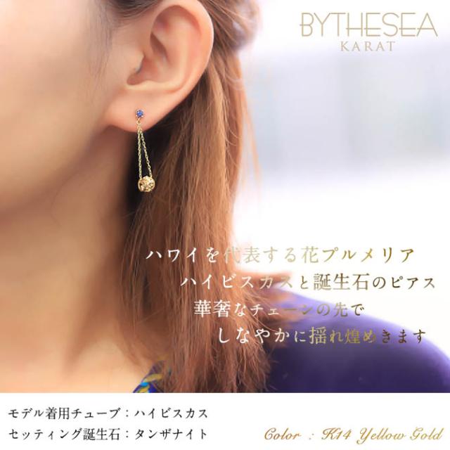 ハワイアンジュエリー ピアス 12月の誕生石 タンザナイト 透かしバレル チェーン カラーストーン プルメリア ハイビスカス 揺れる 片耳(1個)購入可 K14イエロー ピンク ホワイト 選べる BY THE SEA バイザシー プレゼント ホワイトデー 卒業式 入学式 【品番:GE302-12】
