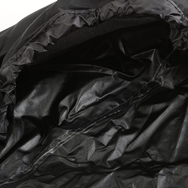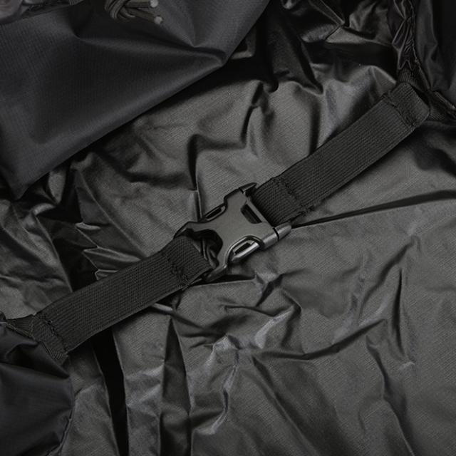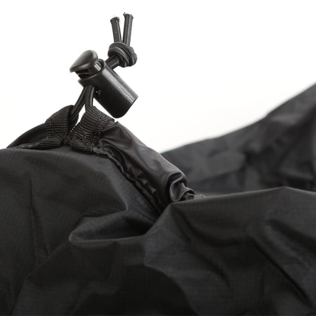 | 固定用ストラップはシンチコードを引っ張り、リュックにフィットさせる仕組みです。カバーに縫い付けられているものよりも汎用性に優れています。 | レインカバー底面部分には念の為の水抜き穴も装備。 |