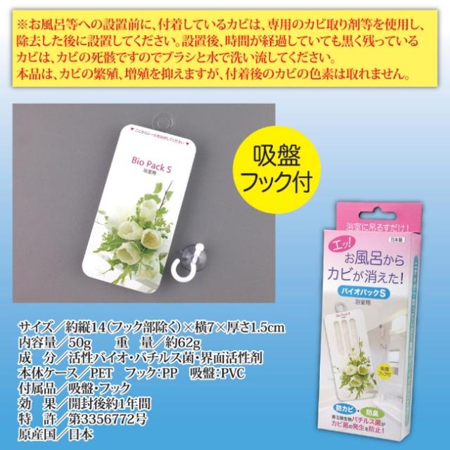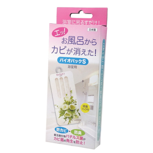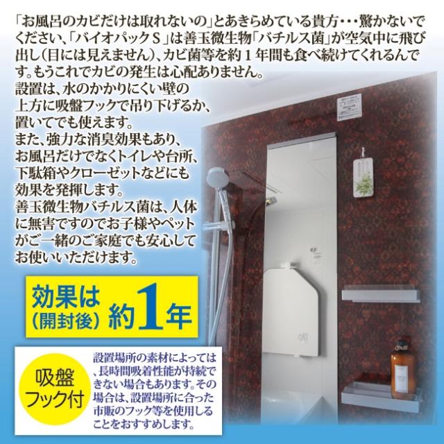 ●ニオイまで取ってしまうバイオ防カビ剤!●人体には無害で効果は約1年間!●これでお風呂掃除がラクになる!●「お風呂のカビだけは取れないの」とあきらめている方に。●「バイオパックS」は善玉微生物「バチルス菌」が空気中に飛び出し(目には見えません)、カビ菌等を約1年間も食べ続けてくれるんです。●もうこれでカビの発生は心配ありません。●設置は、水のかかりにくい壁の上方に吸盤フックで吊り下げるか、置いてでも使えます。●また消臭効果もあり、お風呂だけでなくトイレや台所、下駄箱やクローゼットなどにも効果を発揮します。●善玉微生物バチルス菌は、人体に無害ですのでお子様やペットがご一緒のご家庭でも安心してお使いいただけます。●※お風呂等への設置前に、付着しているカビは、専用のカビ取り剤等を使用し、除去した後に設置してください。設置後、時間が経過していても黒く残っているカビは、カビの死骸ですのでブラシと水で洗い流してください。本品は、カビの繁殖、増殖を抑えますが、付着後のカビの色素は取れません。