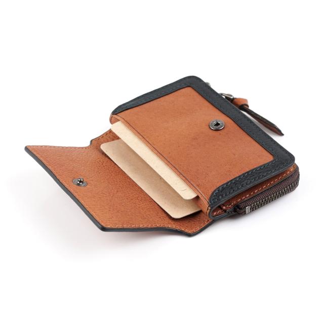 カードポケットはフラップの内側に2か所、背面に1か所、計3枚の収納が可能です。さらにL字ファスナーポケットに小銭や折り畳んだ紙幣を入れることも可能。これ1つで財布代わりにもなるこだわりの逸品です。