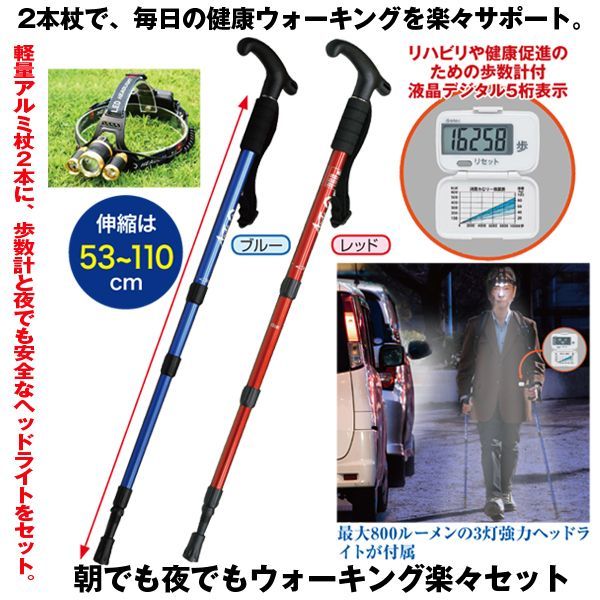 朝でも夜でもウォーキング楽々セット(軽量アルミ杖2本 歩数計 ヘッドライト 同色2本杖 健康 ウォーキング 歩行サポート )