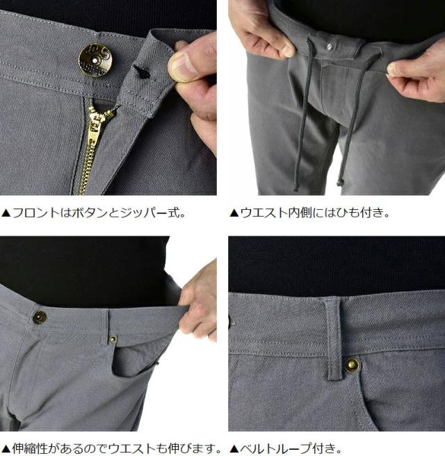 また外装からは見えませんが、ウエストの内側にドローコードを装備しており、 ベルト要らずで穿いて頂く事も可能です。