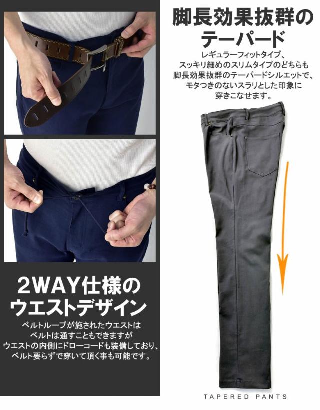 横方向へ抜群の伸縮性を備えたツイル調生地を使用した、テーパードパンツです。