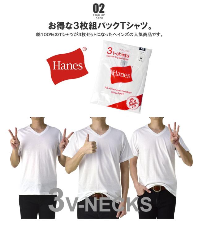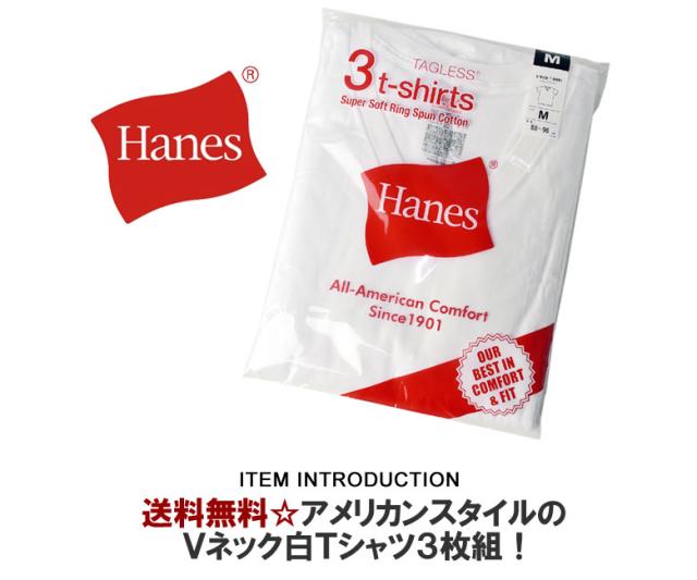 ブランド「Hanes・ヘインズ」の綿100%Vネック白色半袖Tシャツ3枚入りパック商品です。