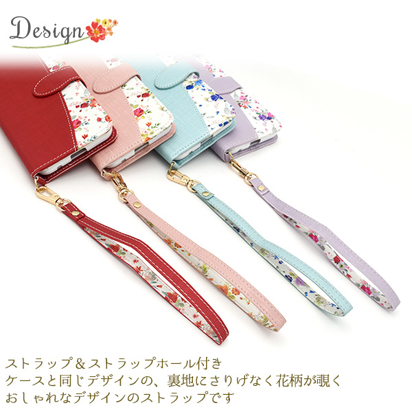 ケースと同色の、裏地にさりげなく花柄が覗くおしゃれなデザインのストラップです。