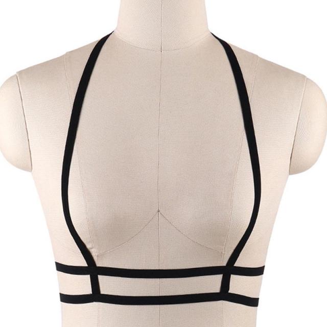 黒い伸縮性のあるポリエステル製のボンテージ風ハーネス。大人セクシーで下着のようなフェチなボディチェーンは個性的なボンデージファッションにぴったり。ユニークな女友達同士で楽しめるフェチなアイテム。