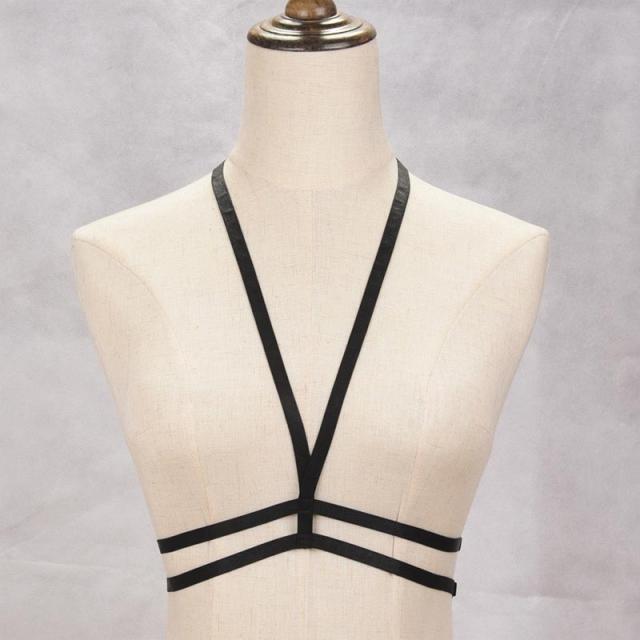 黒い伸縮性のあるポリエステル製のボンテージ風ハーネス。大人セクシーで下着のようなフェチなボディチェーンは個性的なボンデージファッションにぴったり。ユニークな女友達同士で楽しめるフェチなアイテム。