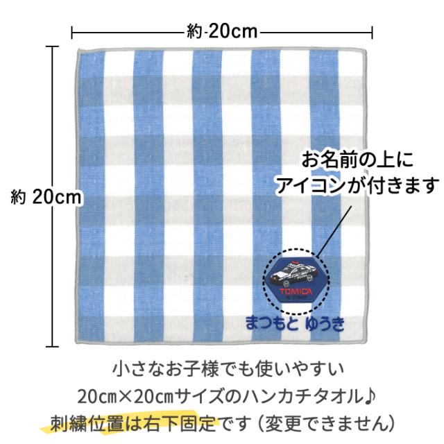 | 商品について | 片面ガーゼ仕様のアイコン付きタオルがリニューアル♪ 表面はコットンガーゼ、裏面はふわふわのパイル地仕様で、やさしい手触りと使い心地のタオルです。 1枚ずつ丁寧にお名前を刺繍してお届けしますので、面倒なお名前つけの必要がありません。 刺繍なのでお洗濯をしてもお名前が消えることなく、長くお使いいただけます。 © TOMY 「トミカ」は株式会社タカラトミーの登録商標です。 |