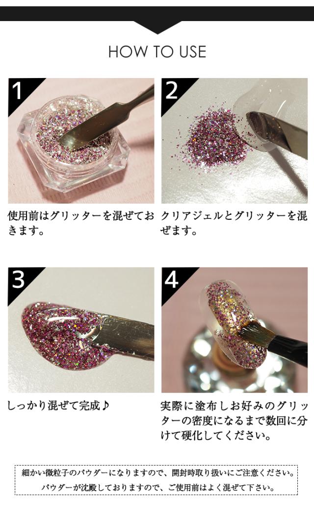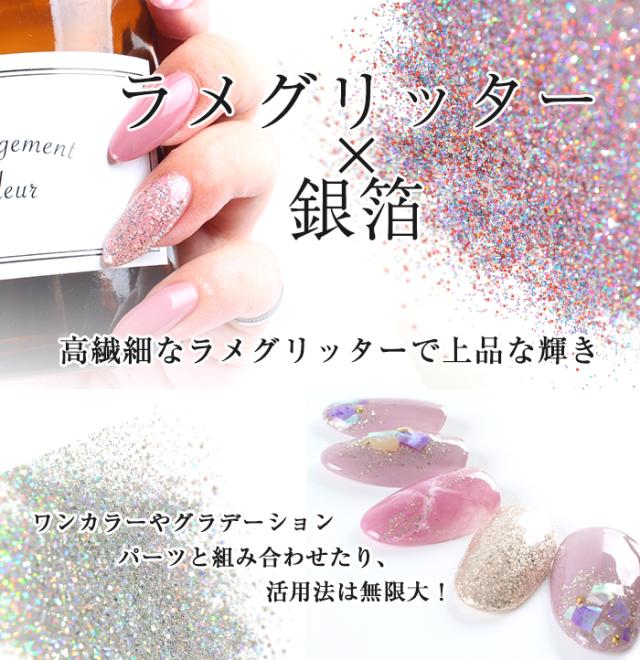 | 商品説明 | 微粒子の銀箔とラメのグリッター ワンカラーはもちろん、パーツのベースとしてもGOOD!! シアーな質感のカラージェルと混ぜて オリジナルのカラージェルにもアレンジ可能です☆ |