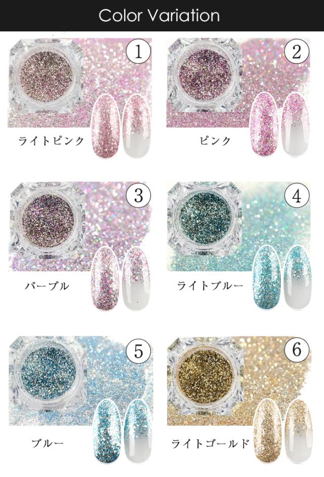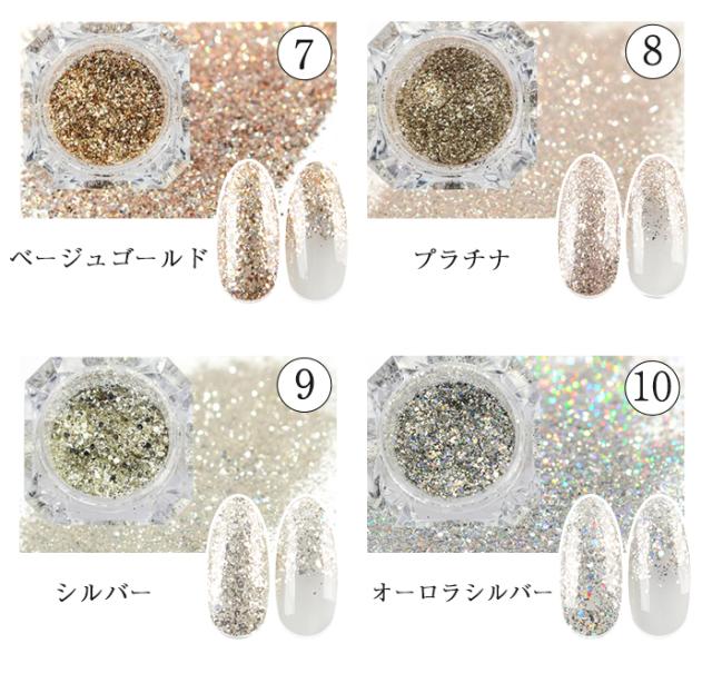 - プラチナとオーロラシルバーを購入しました♪ラメと言うよりパウダーに近い微粒子なので、ザクザクッとしたアートよりグラデーションに向いてると思います。オーロラシルバーは小さめの色んな形のホロもMixされています☆すっごい可愛くて綺麗です☆プラチナはカラーが2〜3種類入ったMixのようで、とても上品に綺麗に光ってくれます。