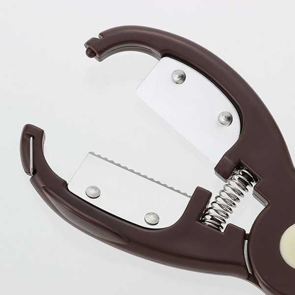 ギザ刃でしっかり固定した栗を、鋭く仕上げた切り刃を使って、ばねの力でスピードカットします。グリップは手にしっくりなじむ形状に指かけが付いています。力を入れても痛くなりません。