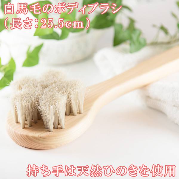 柔らかい白馬毛を使用したボディブラシさくら。持ち手には天然ひのきを使用。