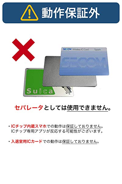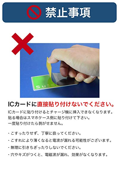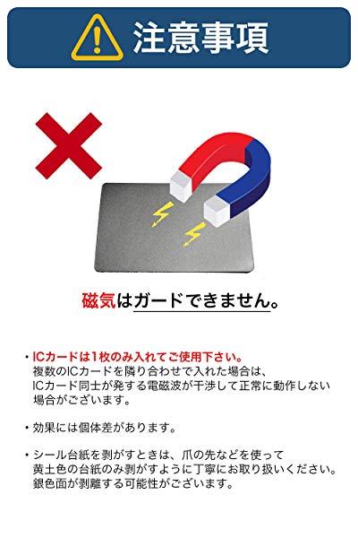 【使用方法】スマホ用背面カード収納ケースに本製品と非接触ICカードと一緒に入れてご利用下さい。紙の説明書はございません。詳細は商品写真3枚目の使用方法をご確認くださいませ。当社ではお客様に出来るだけ安価に本商品を提供するために、このような方針としてしております。ご了承下さいませ。【注意事項】シール台紙を剥がす時は爪の先などを使って黄土色の台紙のみ剥がすように丁寧にお取り扱い下さい。銀色面が剥離する可能性がございます。非接触ICカード2枚の間に挟むようなセパレータとしての動作は保証しておりません。非接触IC内蔵スマホで使用すると誤動作(非接触IC用アプリが反応)する可能性がございます。ご注意下さい。【禁止事項】本商品を貼る場合はスマホケ