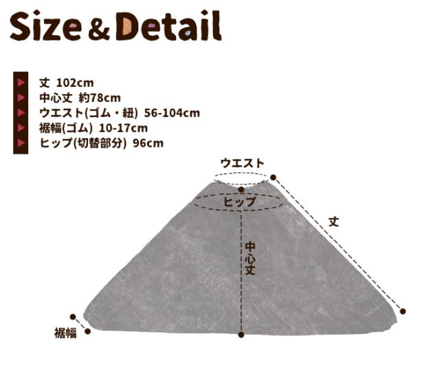 丈102cm 中心丈約78cm ウエスト(ゴム・紐)56-104cm 裾幅(ゴム)10-17cm ヒップ(切替部分)96cm