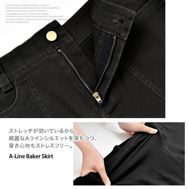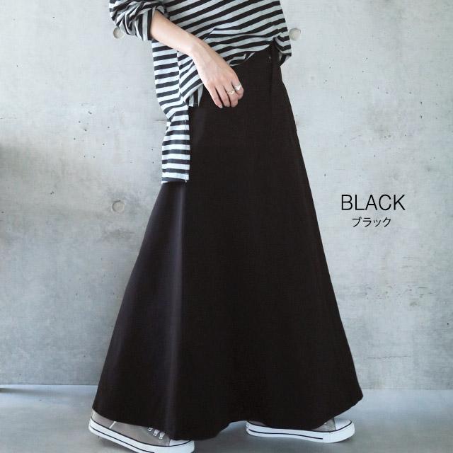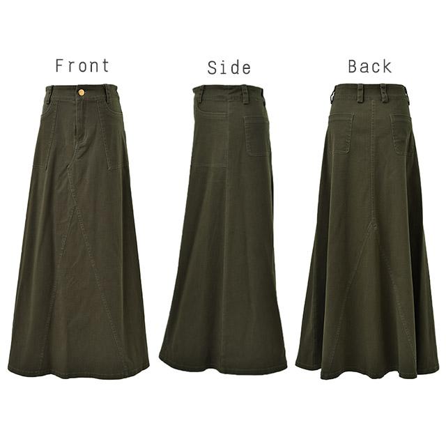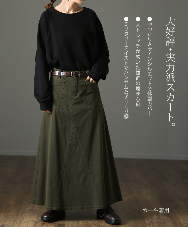 メール便送料無料 スカート ロングスカート マキシスカート ベイカースカート レディース ロング マキシ ベイカー 大きいサイズ 体型カバー Aライン フレア フレアスカート チノ ストレッチ 着痩せ ミリタリー ゆったり 黒 白 カーキ 冬 秋 HUG.U 秋新作