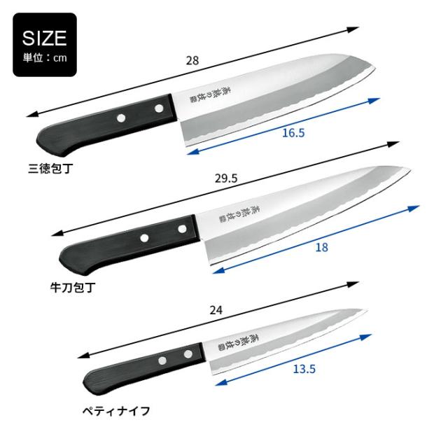 ■製品サイズ(約):●三徳包丁[全長]約28cm [刃渡り]約16.5cm●牛刀包丁[全長]約29.5cm [刃渡り]約18cm●ペティナイフ[全長]約24cm [刃渡り]約13.5cm