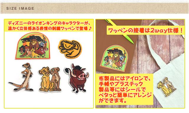 ディズニーの大人気ライオンキングの仲間たちが鮮やかなワッペンで登場いたしました。 刺繍がポイントになっており、接着すればオリジナルのライオンキングのグッツに! この商品はアイロン接着のほか、シールとしてもお使いいただけます。 本商品は、ウォルト・ディズニー・ジャパン(株)と大日本印刷(株)の契約に基づき、株式会社ミノダが製造・販売するものです。 |