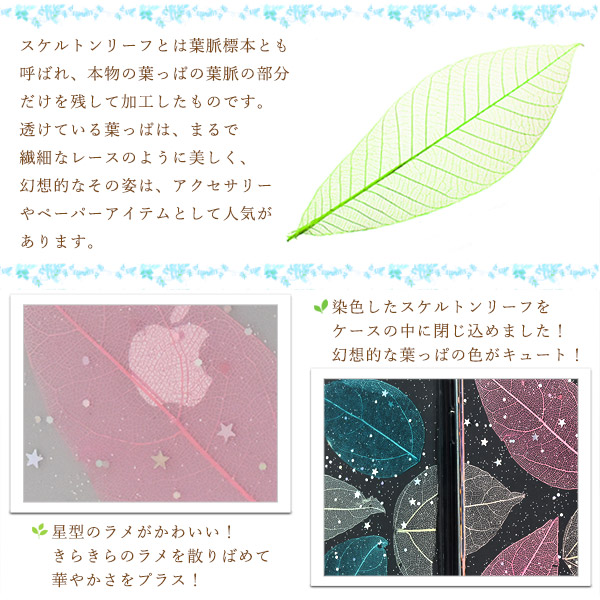スケルトンリーフと、たっぷりと散りばめられたラメが幻想的なケース。