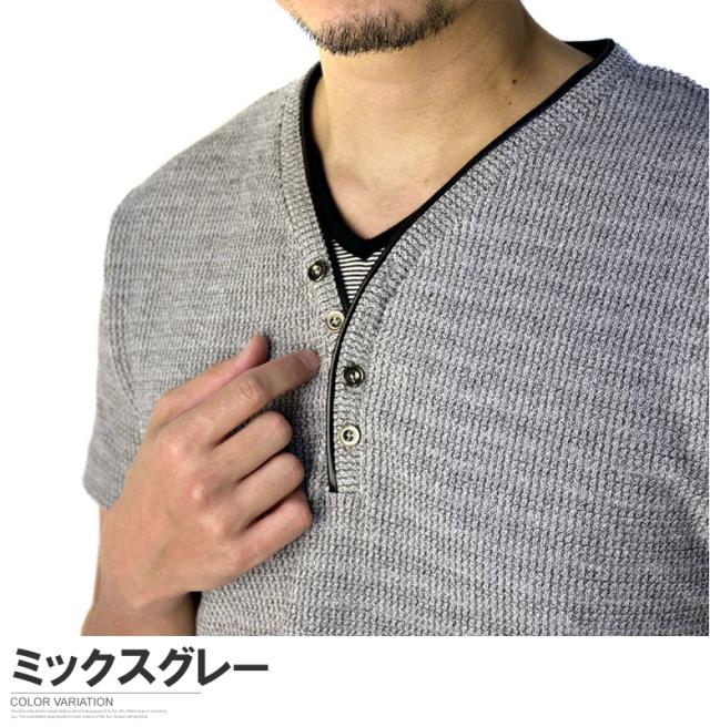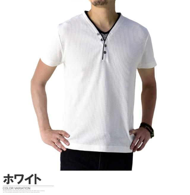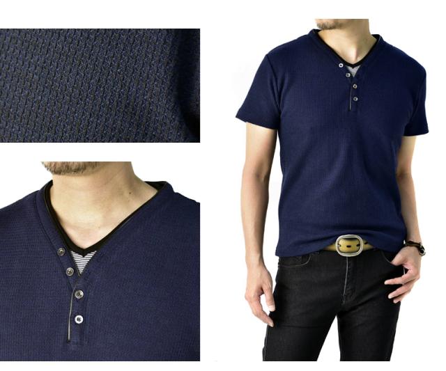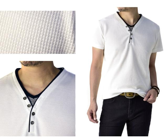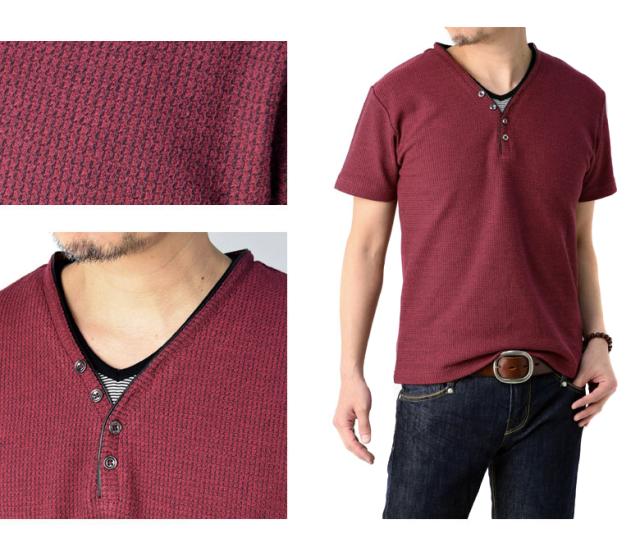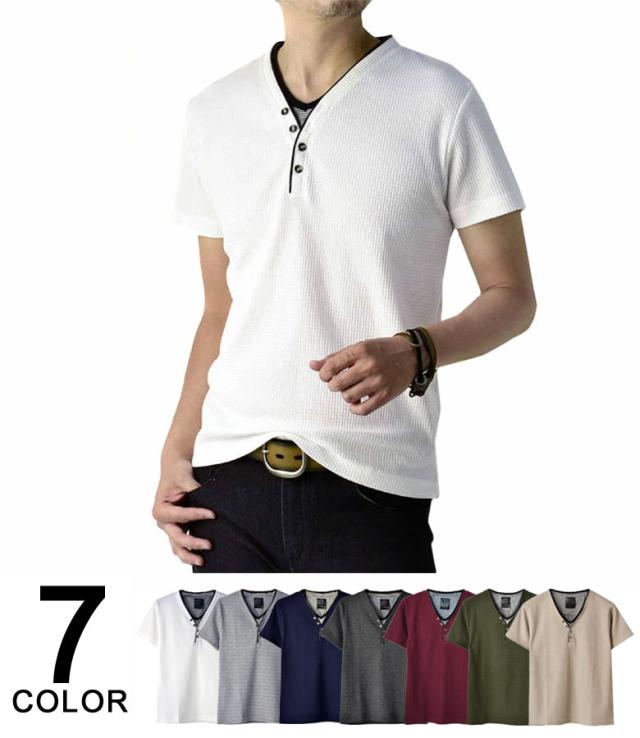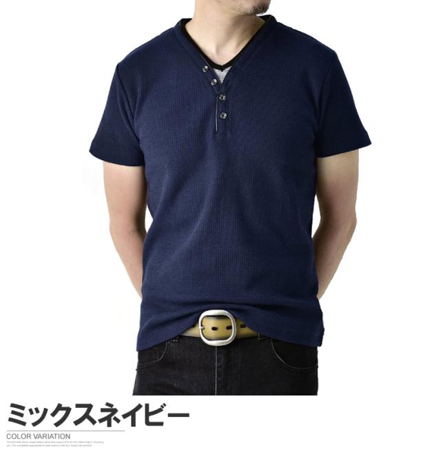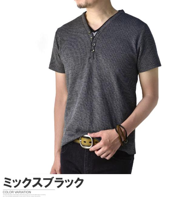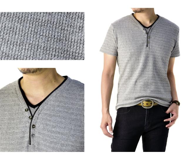 Tシャツ カットソー 半袖 メンズ 送料無料 畦ワッフル 2フェイク ヘンリーネック Tシャツ【B4B】【パケ2】【A】