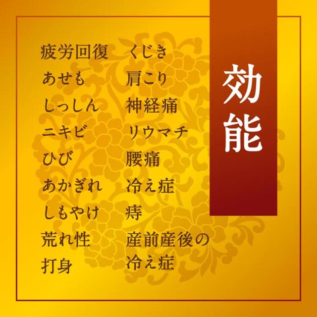 | 疲労回復、あせも、しっしん、にきび、ひび、あかぎれ、しもやけ、荒れ性、うちみ、くじき、肩のこり、神経痛、リウマチ、腰痛、冷え症、痔、産前産後の冷え症 |