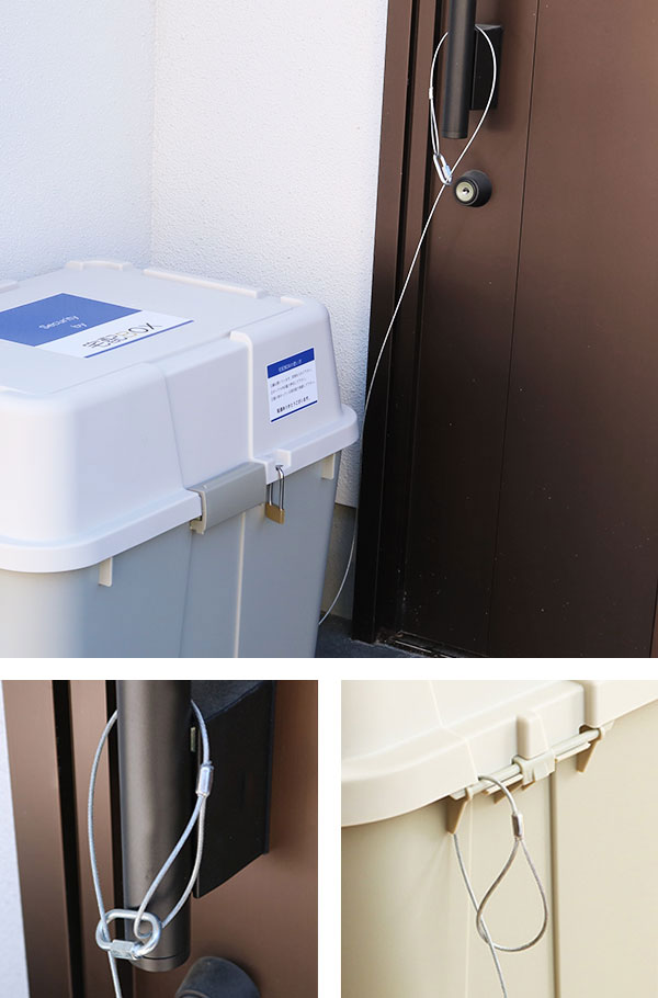 玄関のドアや、柱などに盗難防止用のワイヤーを取り付けてください。取り付ける所がない場合はワイヤーをドアに挟んでも大丈夫です。ドアの施錠後は連結リングが引っかかって止まります。