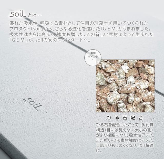 吸水性の高さを誇る注目素材「珪藻土(けいそうど)」で作られたGEM ペーパータオルケースの登場です。「珪藻土」に新たに「ひる石(鉱物の一種)」が配合された新シリーズ「soil GEM」は、さらに性能がアップ。吸水性、軽さ、丈夫さ、目詰まりのしにくさなど、毎日使うものだからこその良さを感じることができます。また「ひる石」が配合されたことで、石のような見た目で高級感があり、インテリア性も高く生活感を感じないスタイリッシュなデザインです。品質にこだわった自然素材を使用した日本製で安心してご使用いただけます。