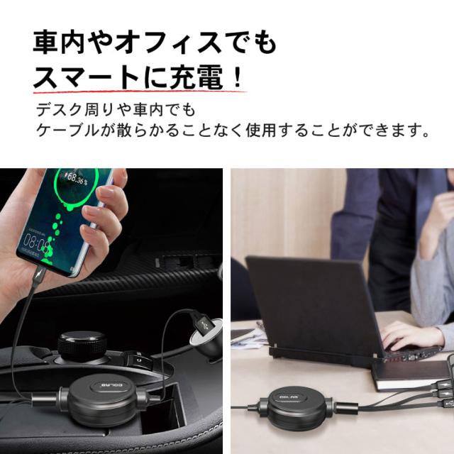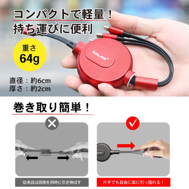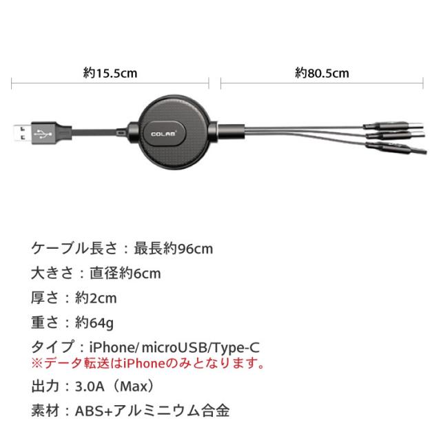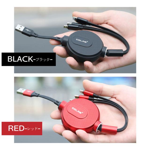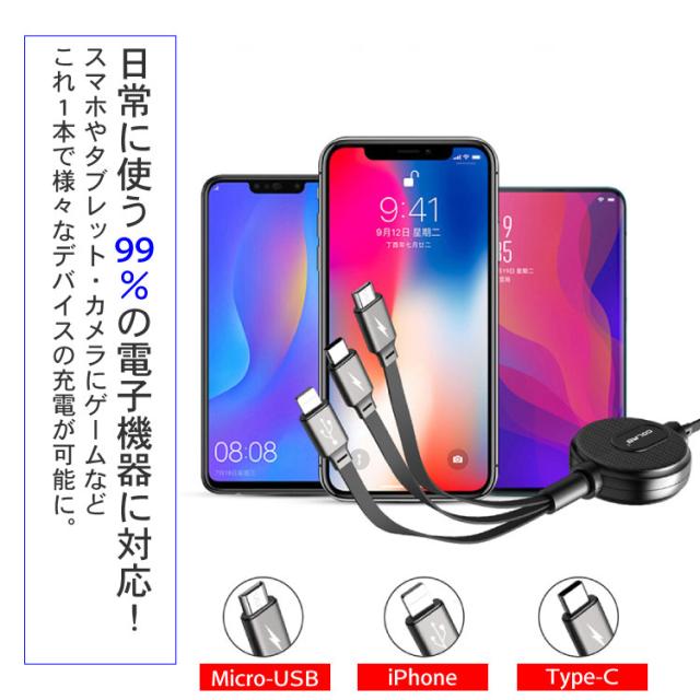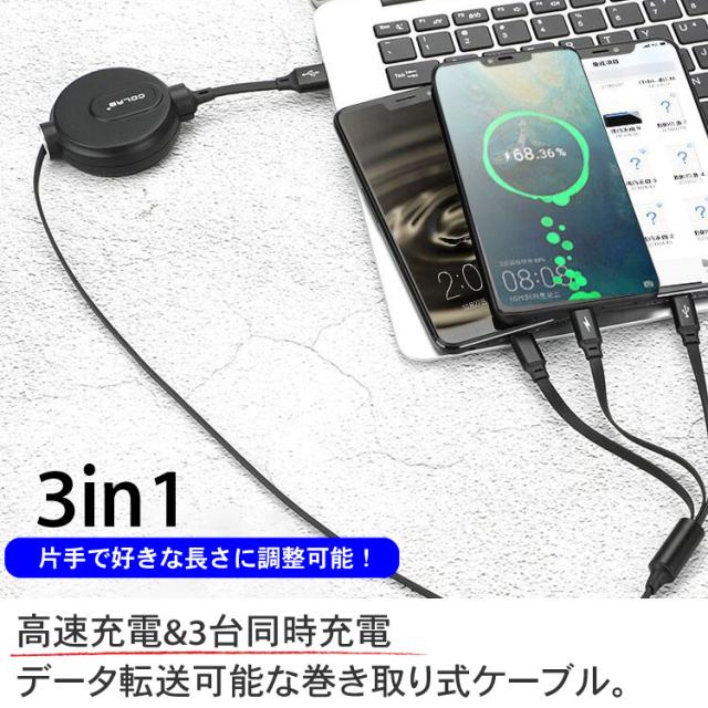 3in1ケーブル 充電器 iPhoneケーブル Lightning / Micro USB / USB Type-C 急速充電 ケーブル 巻き取り データ転送 microusb typec ライトニング iPhone Android