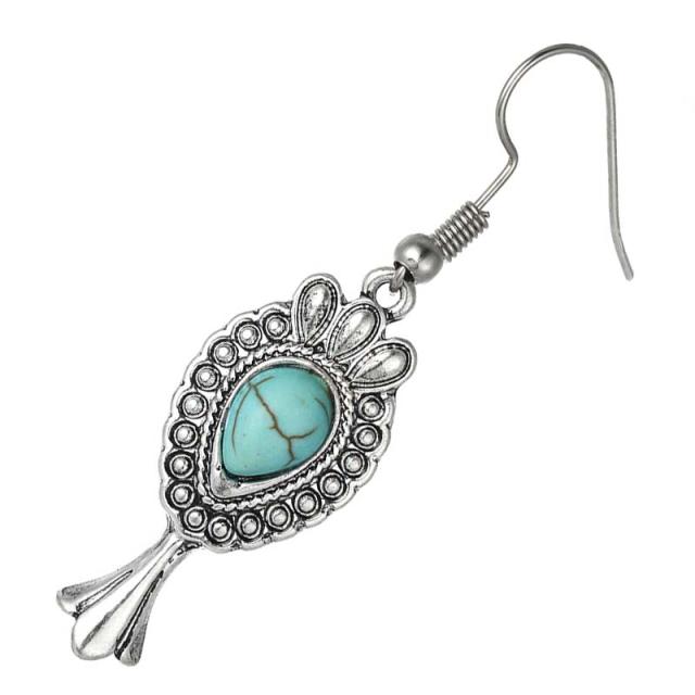 ボヘミアンなスタイルをアシストしてくれるステンレスピアス。存在感のあるトルコ石がおしゃれ心をくすぐる。アンティークシルバーと鮮やかなターコイズがクラシックな雰囲気を醸し出す。プレゼントにもきっと喜んでもらえます。フックパーツを別売りのイヤリングパーツに変更してイヤリングにもできる。ご自分で加工するのが面倒なときはお気軽にお申し付けください。