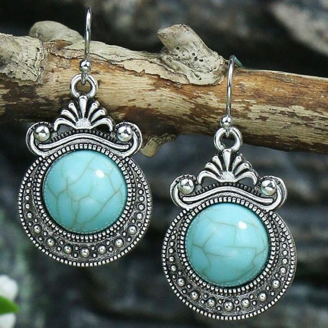 王冠と三日月をモチーフにしたの銀色シルバーの台座に天然石風のイミテーションのターコイズをセットしたボヘミアンスタイルのステンレスピアス。