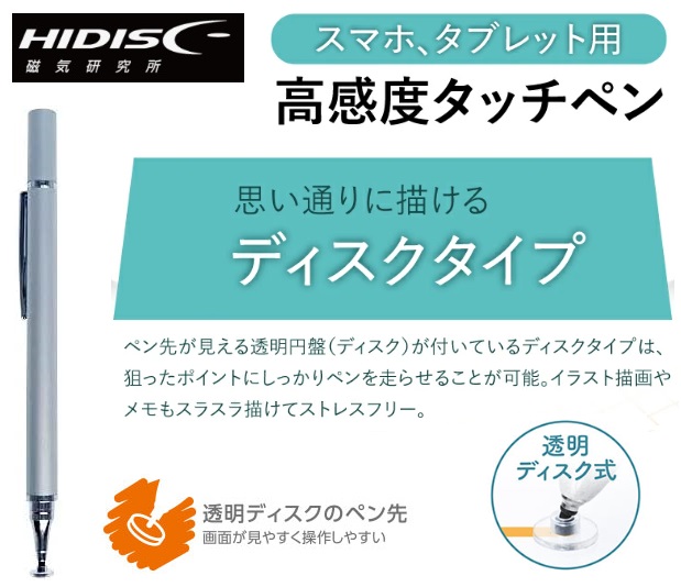 透明なディスクタイプのペン先により、狙い通りに細やかな操作ができるタッチペンです。