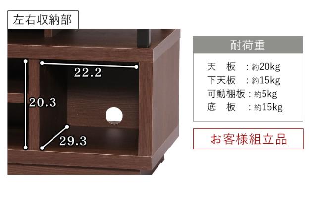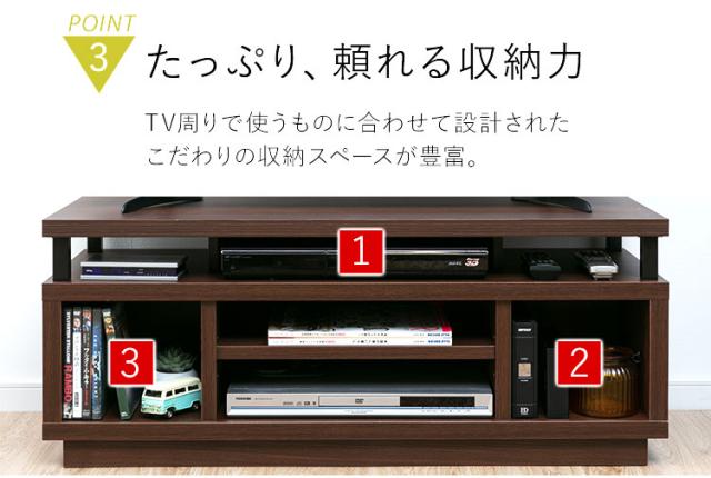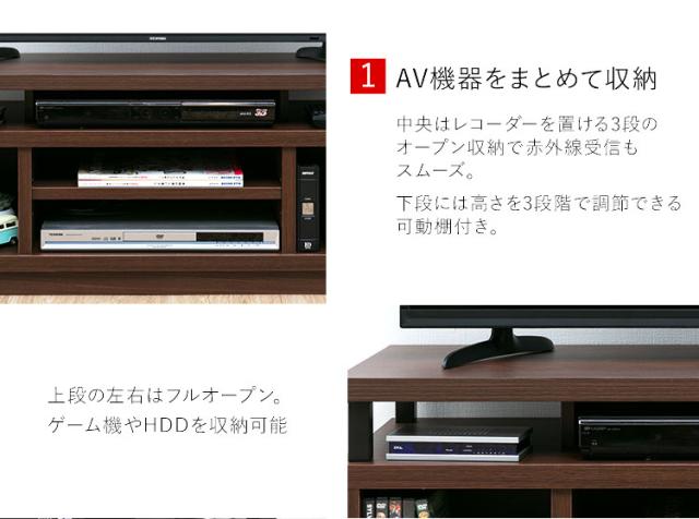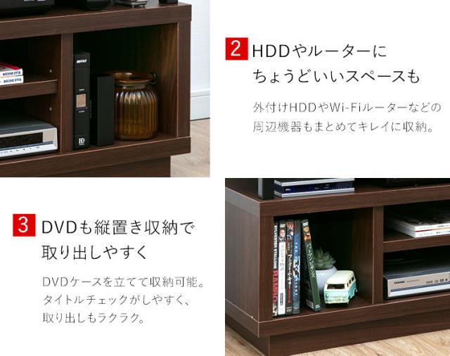 上段にはレコーダーやHDDなどが置けるオープン収納が3箇所、下段は中央に2段のオープン収納、サイドにDVDを縦置きできる収納スペースがあります。