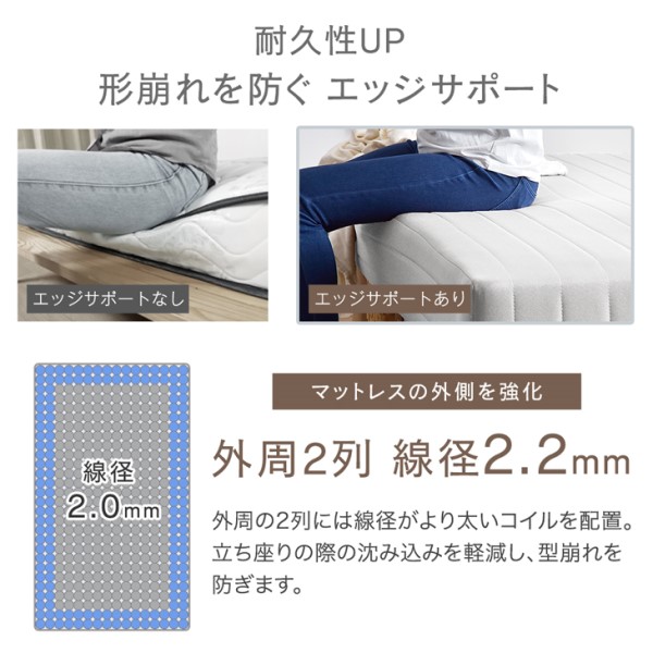 ※こちらの商品は、2022年12月6日より、ナチュラル脚からマットレスと同色のワントーンデザインに、カバーを取り外ししやすいボックスシーツ型に変更、横幅120→115cm、コイル数589→558個、フレームが木製→スチールに仕様変更しました。