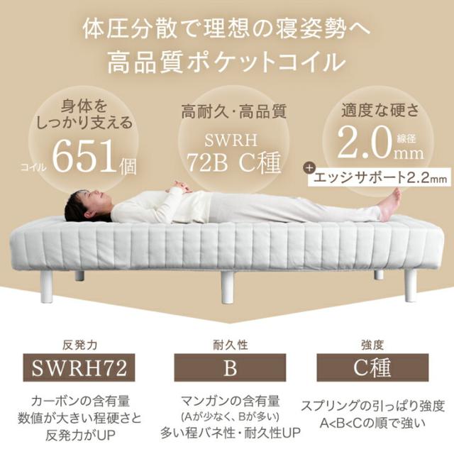 ※こちらの商品は、2022年12月6日より、ナチュラル脚からマットレスと同色のワントーンデザインに、カバーを取り外ししやすいボックスシーツ型に変更、横幅140→135cm、コイル数682→651個、フレームが木製→スチールに仕様変更しました。
