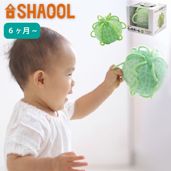 SHAOOL シャオール わっかボール ミニ めろん 布製ガラガラ ~ 出産祝い、ハーフバースデイ、男の子・女の子の誕生日プレゼント、クリスマスプレゼントにおすすめの、自由な発想、発展する遊びが楽しい、静岡発の知育玩具メーカー「SHAOOL シャオール」の知育玩具です。