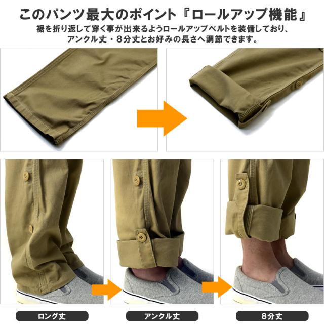 裾を折り返して穿く事が出来るよう、ロールアップベルトを装備しており、 アンクル丈、8分丈とお好みの長さへ調節できます。