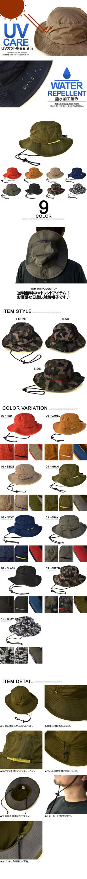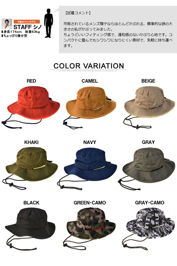 | ※こちらのお品はゆうパケット便発送(ポスト投函)にて送料無料中です。 本品を含めた複数点のご注文を頂いた場合には、梱包サイズに応じて、 ゆうパケット便、または、宅配便発送にてお届け致します。 撥水素材で作られた、アドベンチャーハットです。 トレッキングやハイク等アウトドアからタウンユースまで、いつでもかぶりやすい帽子。 UVカット率99.9%。 熱だまりを抑えるベンチレーションに、フィット感調節用のドローコードと、取り外しが可能な顎ヒモを装備。 そして、小さく畳んで持ち運べるので便利♪ 別名サファリハットやブッシュハットとも呼ばれ、人気・注目度ともに急上昇中のアイテム。 お洒落な日差し対策帽子です♪ ■上記掲載画像のモデルは身長174cm・体重63kgでMサイズを着用しております。 ※お客様のディスプレー環境により色が多少違って見える場合がございます。予めご了承ください。 |