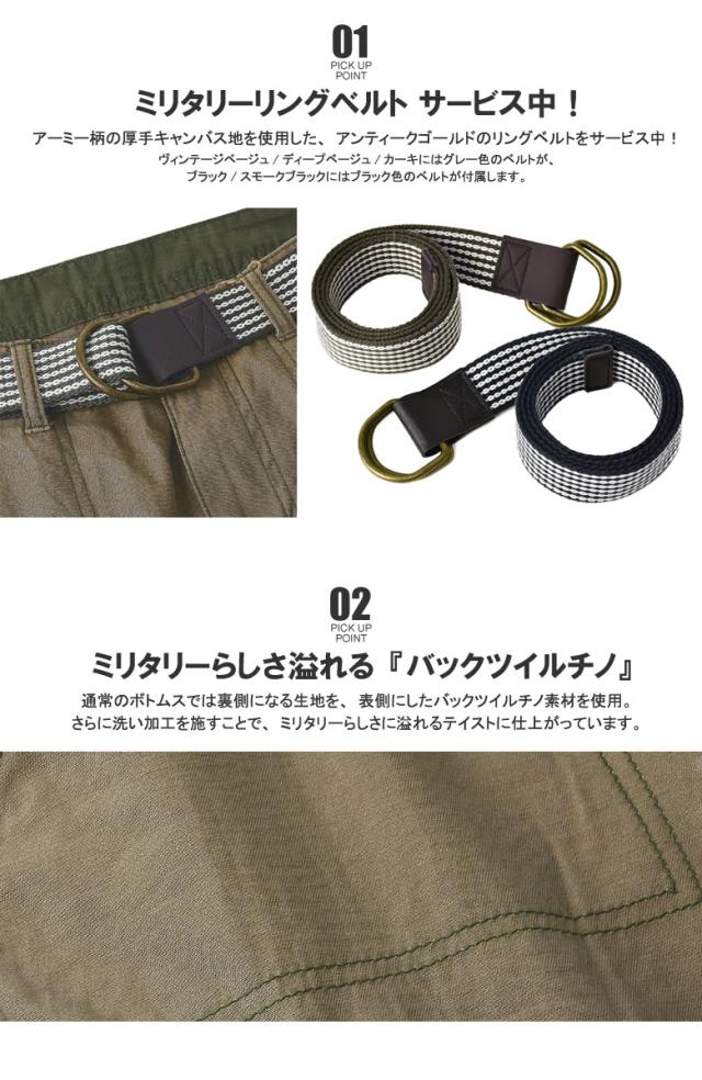 ●いかにもミリタリーな風合いを醸し出す「バックツイルチノ」を使用したカーゴパンツ。
