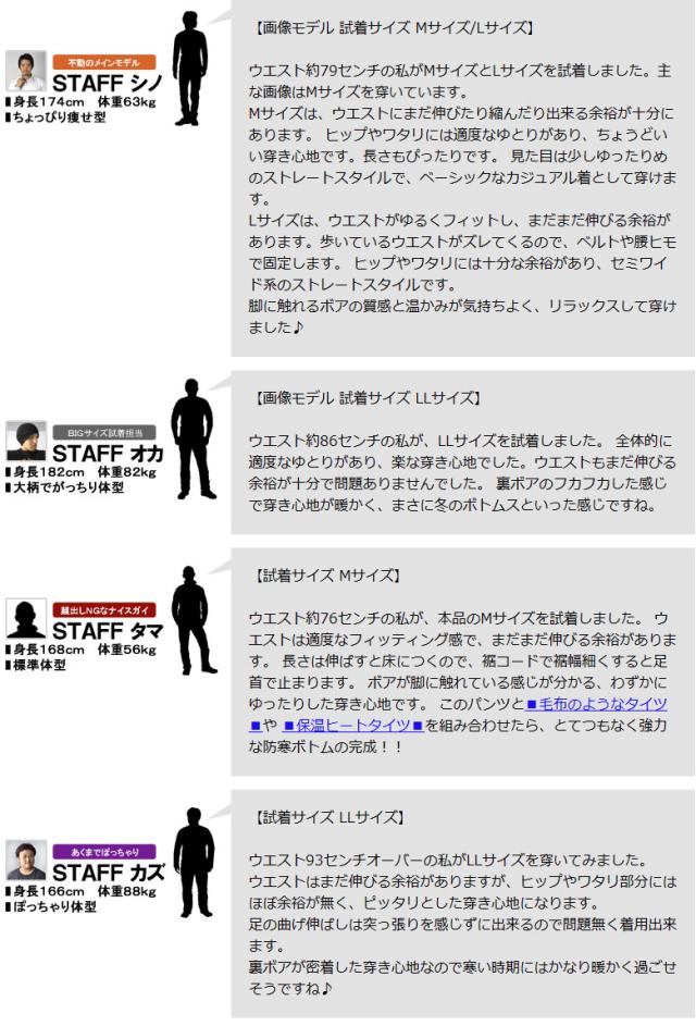 - 裏起毛がフカフカでとても温かいパンツです。 デザインも良く気に入ってます。欲を言えば左後ろポケットがあったら良かったのですが、サイドポケットがあるのでさほど不便はありません。