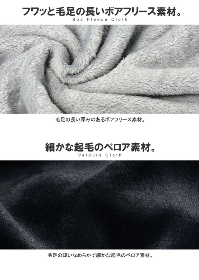使われている素材は一般的なフリース素材よりも厚く、 ボアフリース面、ベロア面と加工し、ふわモコで暖かい素材です。