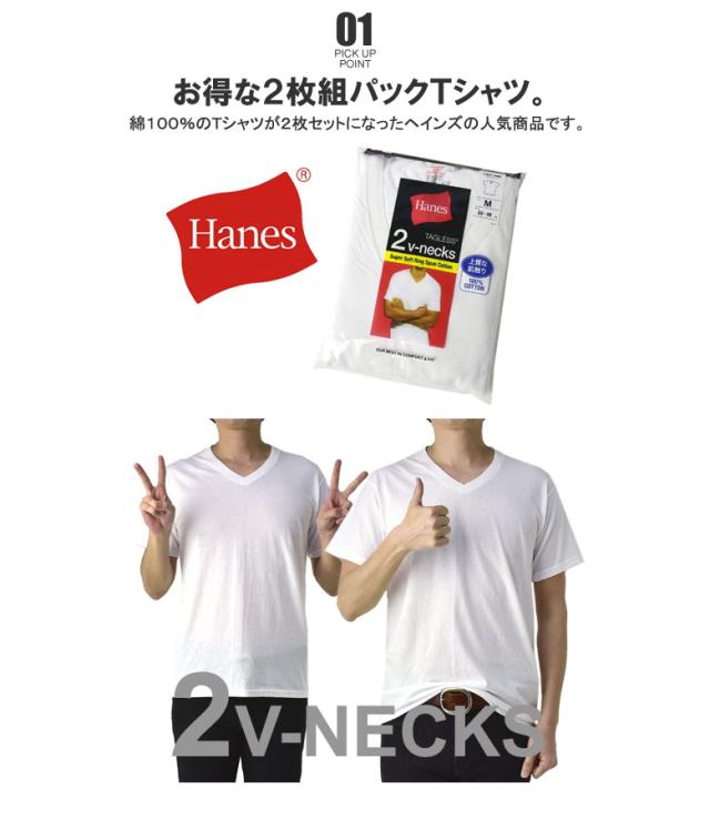 ブランド「Hanes・ヘインズ」の綿100%Vネック白色半袖Tシャツ2枚入りパック商品です。